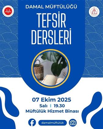 İlçe Müftülüğü Gençlik Koordinatörlüğü tarafından organize edilen ve her hafta salı günleri yatsı vaktinde İlçe Müftümüz İbrahim AFACAN tarafından erkeklere yönelik olarak gerçekleştirilen "Tefsir Dersi"ne tüm kardeşlerimiz davetlidir.
